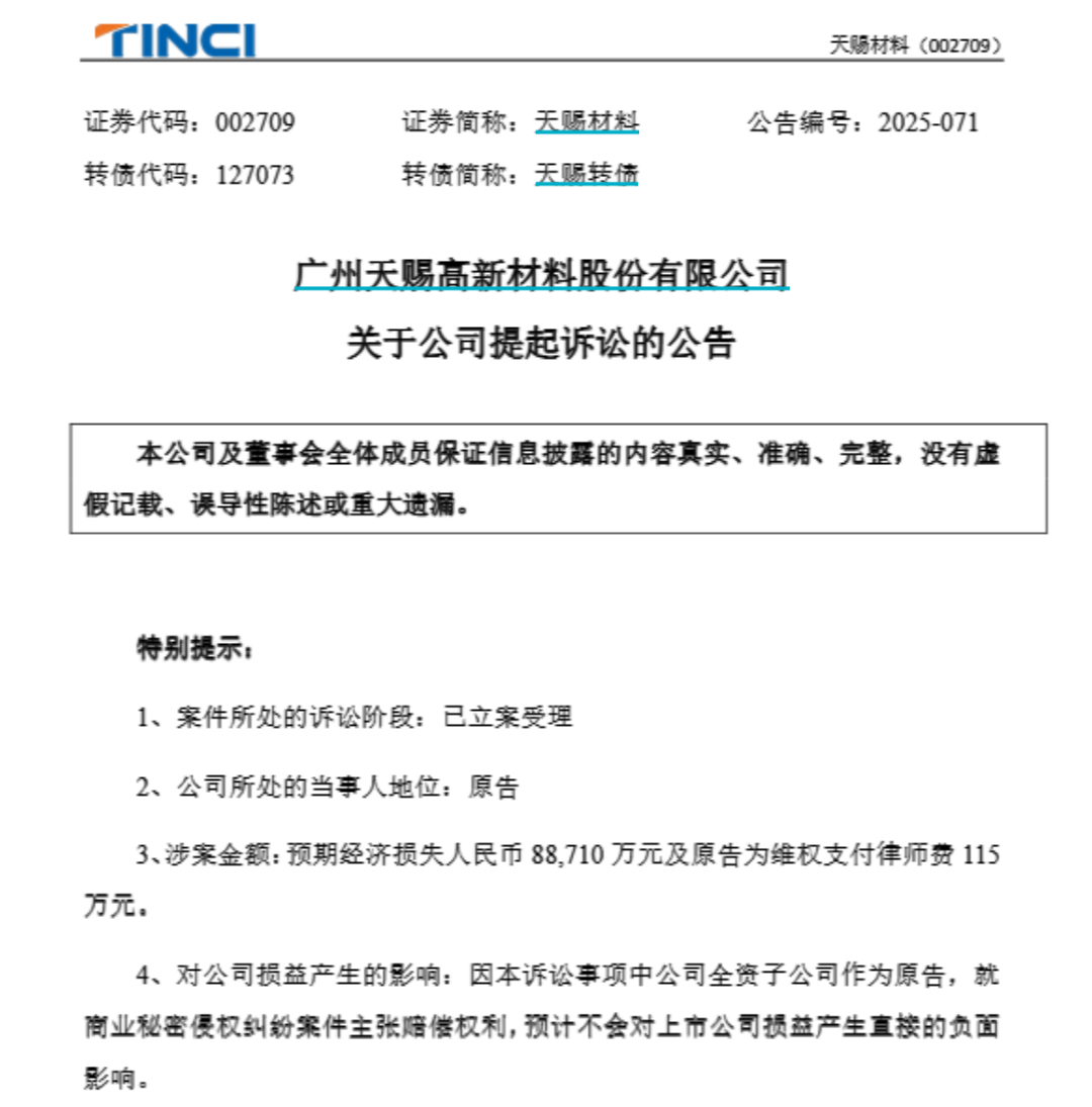 天赐材料表示,因本诉讼事项中公司全资子公司作为原告,就商业秘密侵权纠纷案件主张赔偿权利,预计不会对上市公司损益产生直接的负面影响。